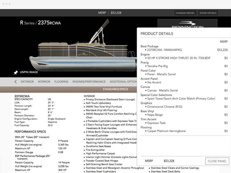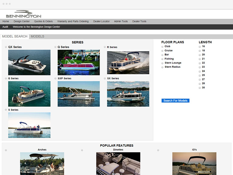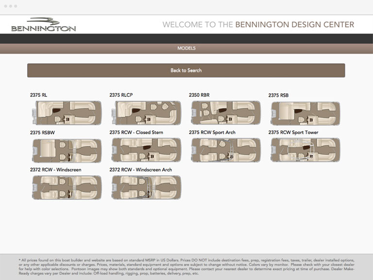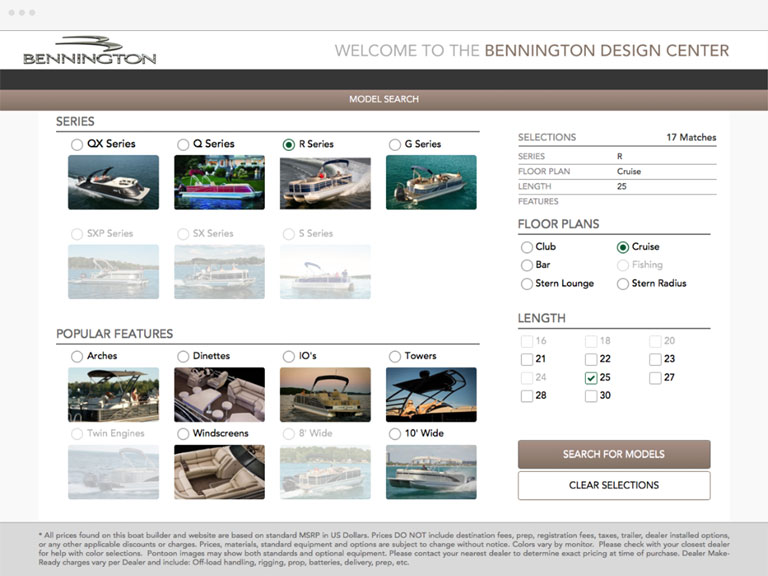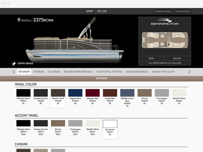 UI Redesign: Bennington’s web site already had an established brand style, so it was a simple matter to adapt this to the Bootstrap scaffolding of the CPQ. The color and type standards were applied and adapted, and new styles were introduced to accommodate unique system components.