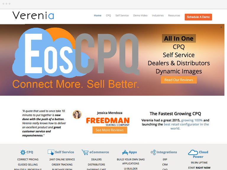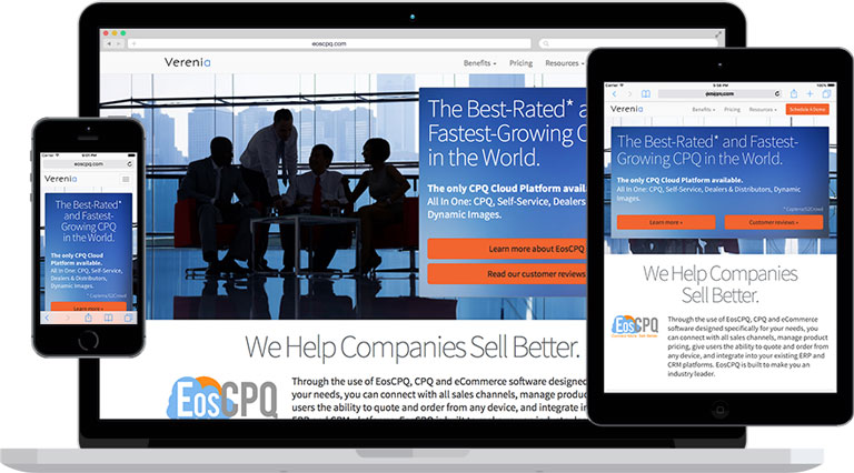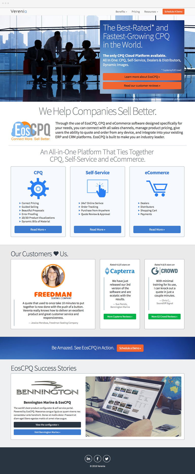 UI Redesign: Visitors were arriving at the landing page, but leaving without scrolling below the fold to read the rest of the content. Having previously assisted Verenia with a successful redesign of Bennington Marine’s CPQ system, they asked me to help them update their EOSCPQ promotion site. They wanted to create a more upscale look, rewrite the content, replace the animated slideshow with something more striking, and make the whole package look better on mobile devices.