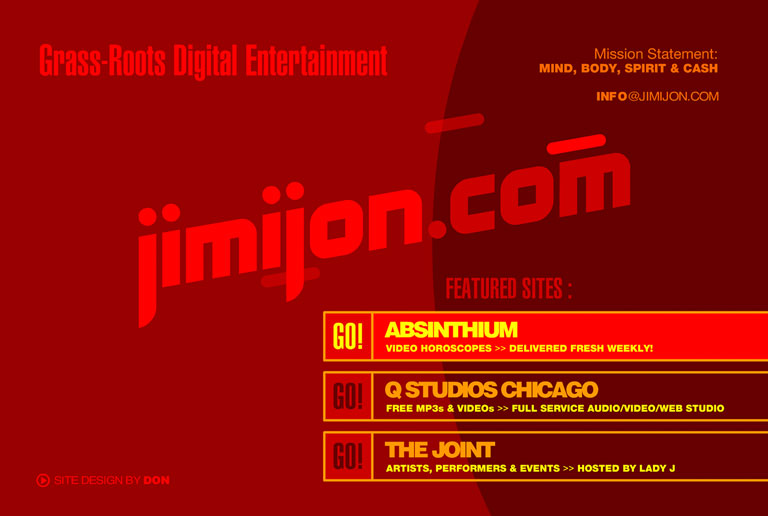 UI Design (& Flash): The very first version was an animated Flash website that linked to various affiliated properties, including music and video production company Q Studios and Absinthium.com, for which we produced weekly video horoscopes in the pre-Youtube days of yore. The Jimion.com logotype I created for the original site is still in use to this day, and it inspired a full alphabet that I assembled into the Jimijon font – the latest version of which is available for download if you send me a message via the contact form.
