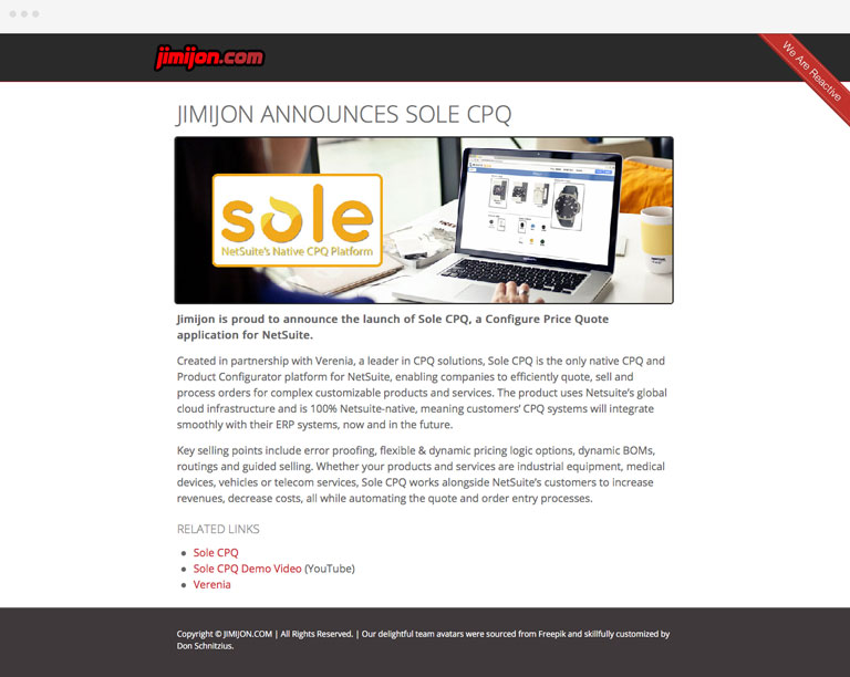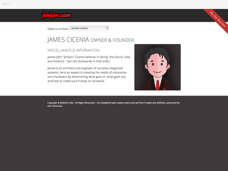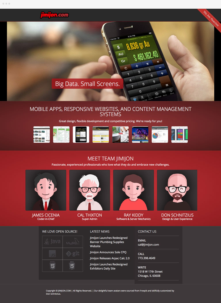 As James’ business moved from original content to development projects for clients, the site evolved from custom web pages to Joomla CMS. For this latest version, in addition to customizing the Joomla theme to reflect the traditional brand colors, I created product mockups for the slideshow, cute avatar illustrations for the team section, and have wordsmithed the front page, bios and all the project launch articles.