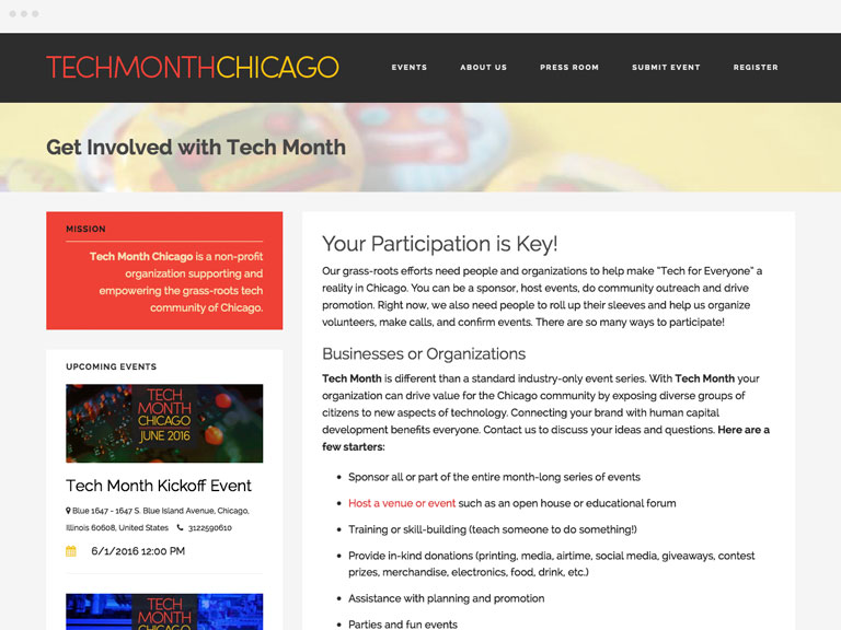 The Event Builder theme gave us the core of what we’d need: an engine for adding and updating events, and a framework for organizing and presenting all of them to visitors. The front end tasks included formatting and adding art, customizing the fonts and colors via CSS, while the back-end required some tweaking of PHP files to customize the email response system and other site functions.